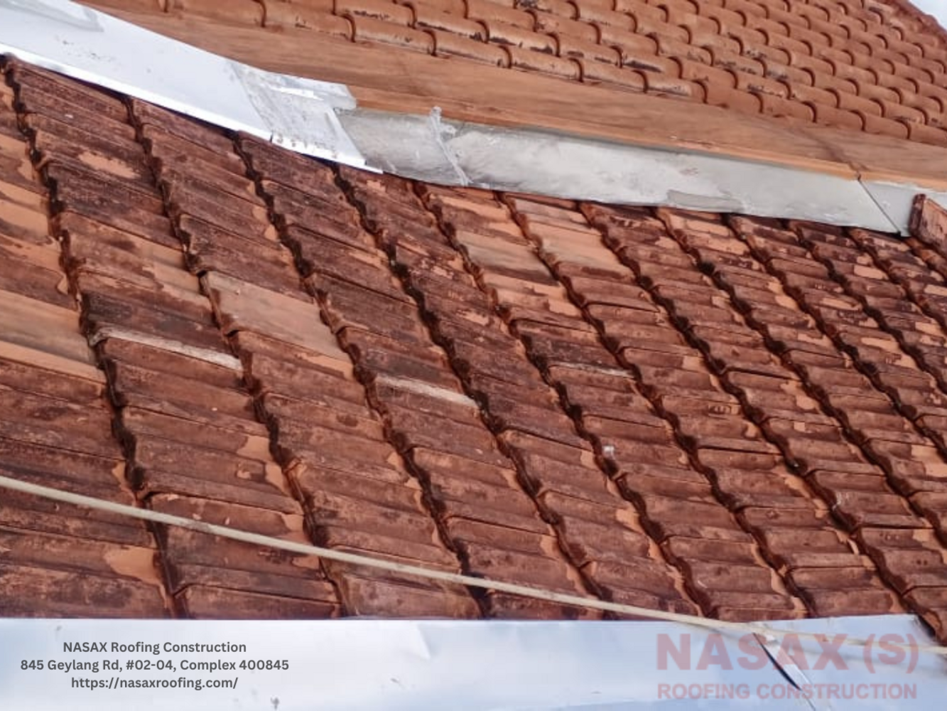Metal flashing at ridges, hips and walls is the most common leak source in Singapore. Sealant degrades faster in tropical sun.